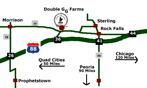 directionsTake Interstate Highway 88 to Exit 36. Go 1/2 mile to a four way stop and continue straight ahead on RT 30. Go 1/8 mile and turn right under the Double G Farms gateway. map